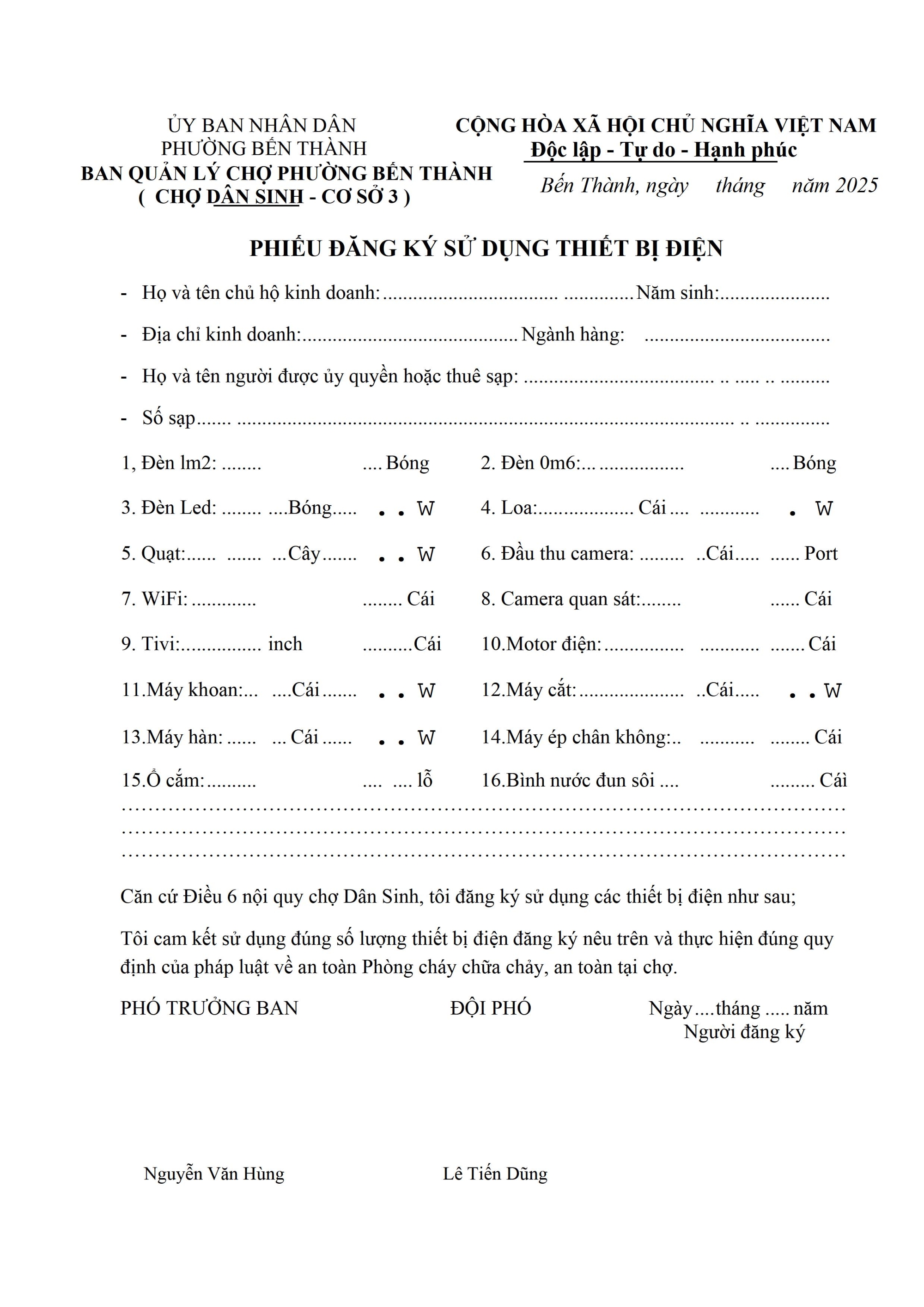 MẪU ĐĂNG KÝ SỬ DỤNG THIÊT BỊ ĐIỆN